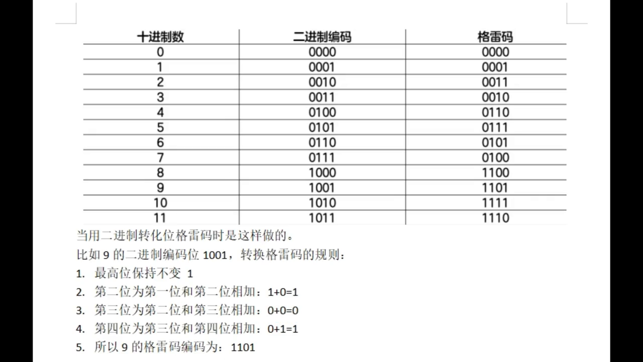 但是这种编码方式是如何来的?看一下下面的方式,当二进制转化为格雷玛时是这样做的。最高位保持不变,然后第二位为第一位和第二位相加,比如用1+0就等于1,第三位为第二位和第三位相加就是0+0等于0,第四位为第三位和第四位相加0+1等于1,所以9的格雷码编码为1101。