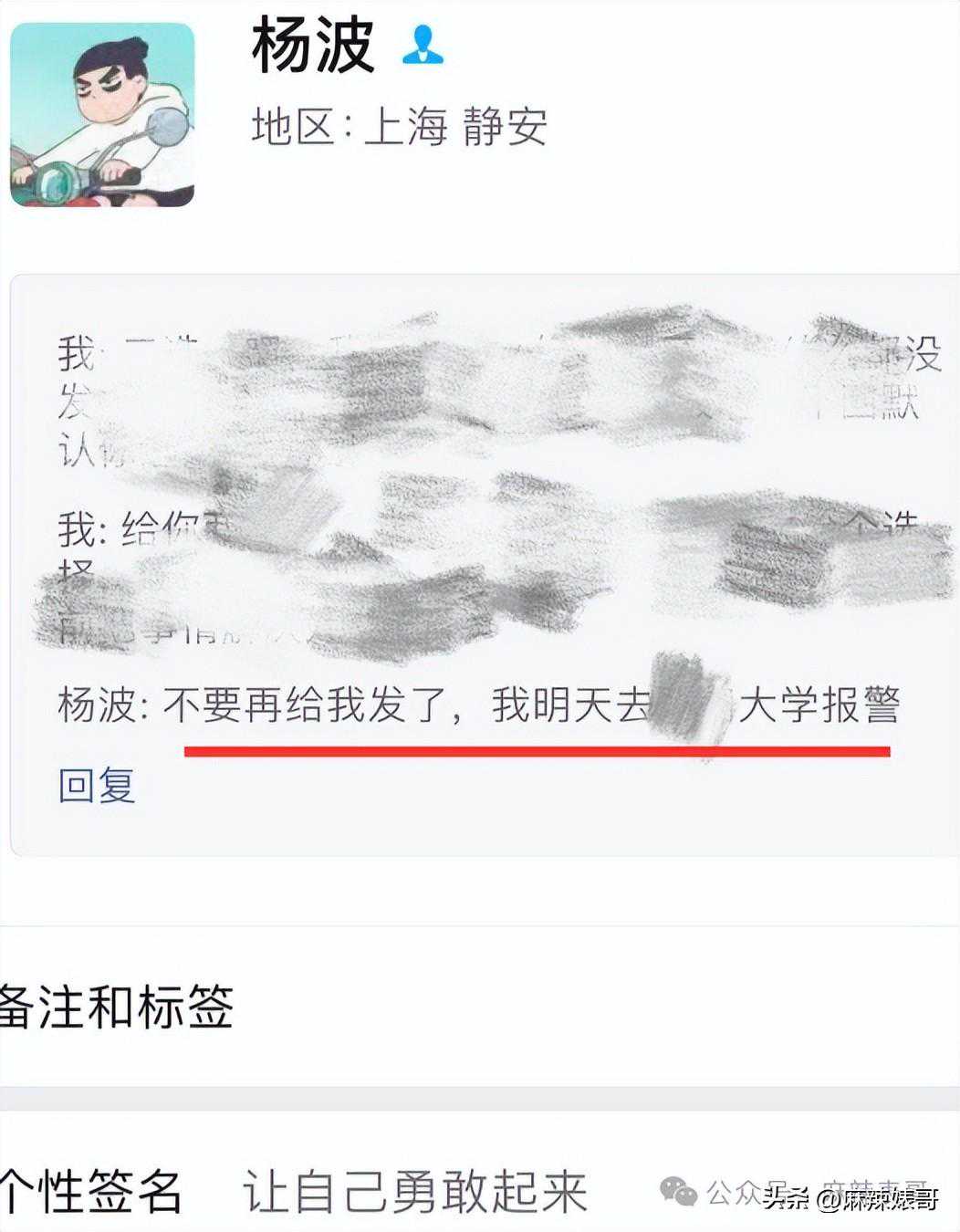 这一点可能是因为杨波女友在聊天中用女生的私人信息去威胁了她。