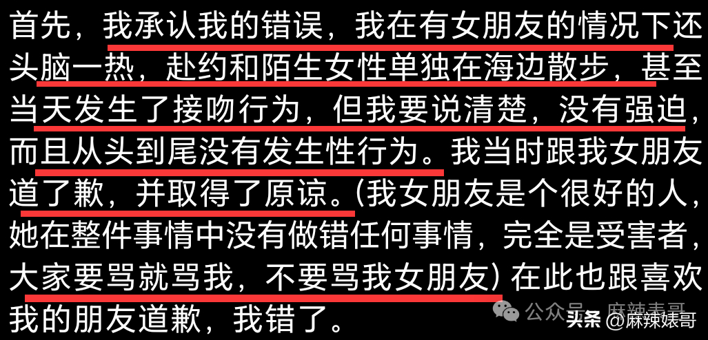 感情上的事本就是他理亏在先,一是劈腿,二是劈腿后没有好好处理,最后遭到素人曝光,作为公众人物最好的回应是“犯错就要认,挨打要立正”,最坏的回应是狡辩。