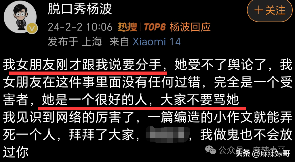 过了一晚,杨波出来了,补充了更多的细节和自己的说法,整个瓜变得饱满和精彩。