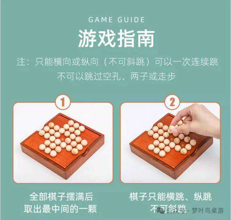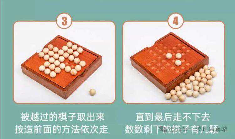 玩的时候是像跳棋一样行子。一棋子依直线在平行或垂直(不能依斜线)的方向跳过一棋子,而放在此棋子之后的一个空格内。故此,棋子后必要有空的孔才可跳过。每次棋子跳去一个空孔,被跳过的棋便移离棋盘。这时棋盘上便少了一只棋子。如此一直玩下去,使剩下来的棋子越少越好。