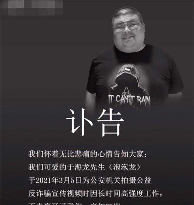 今天,我们获悉一个令人震惊的消息:网红泡泡龙(本名于海龙)突然离世。据公开的讣告显示,于海龙是因为长时间高强度的工作,最终因过劳而去世,年仅29岁。