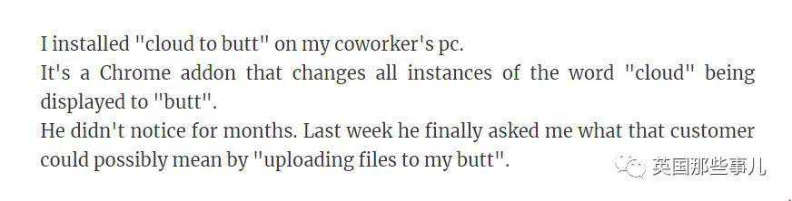 我给我的同事电脑下了一个叫“云端到屁股”的插件,这是一个Chrome插件,可以把所有看到的“云端”这个单词转换为“屁股”。