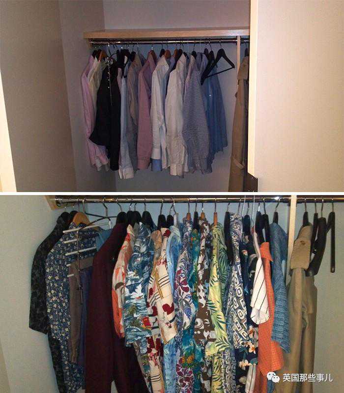 第二天上班的时候,当这个男的打开衣柜企图换衣服的时候,整个人都懵逼了5-10秒,然后哈哈大笑,最后只能无奈的挑了一件花衬衫穿上……