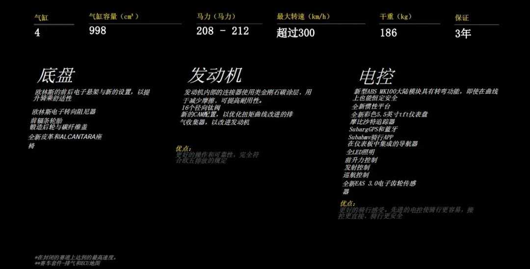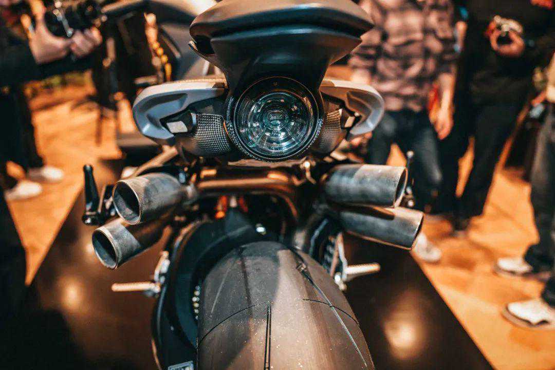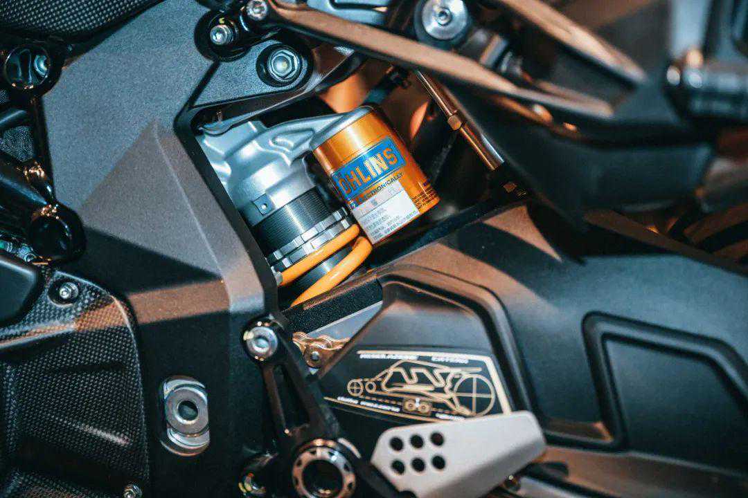 车架方面采用了高刚性的铬钼钢管状车架和铝合金后摇臂。减震系统为Öhlins电子减震系统,相比老款进行了重新调校,搭配了Alcantara坐垫,提供更好的舒适性。整车多处采用碳纤维材质,经过极致的轻量化净重只有186kg,搭配1415mm短轴距设计,应该是一款极其灵活的速度机器。