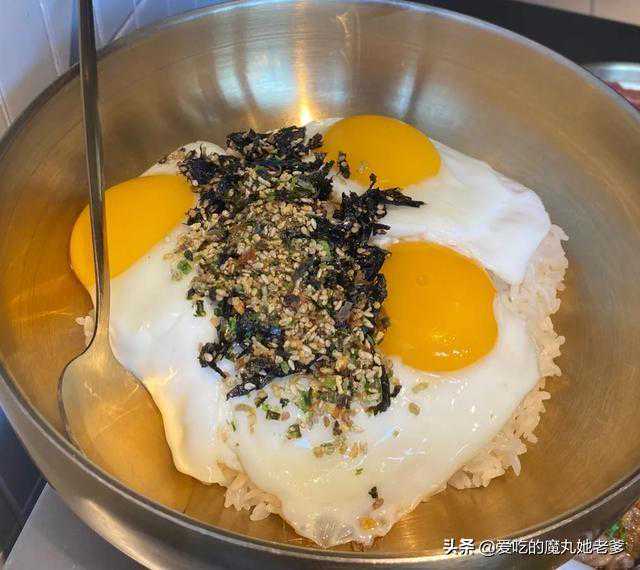 你说有多好吃吧,它还没有那么好吃,就是在吃完烤肉以后想来一份这个老式拌饭。把那个天鹅蛋烤好以后拌到饭里会更好吃!