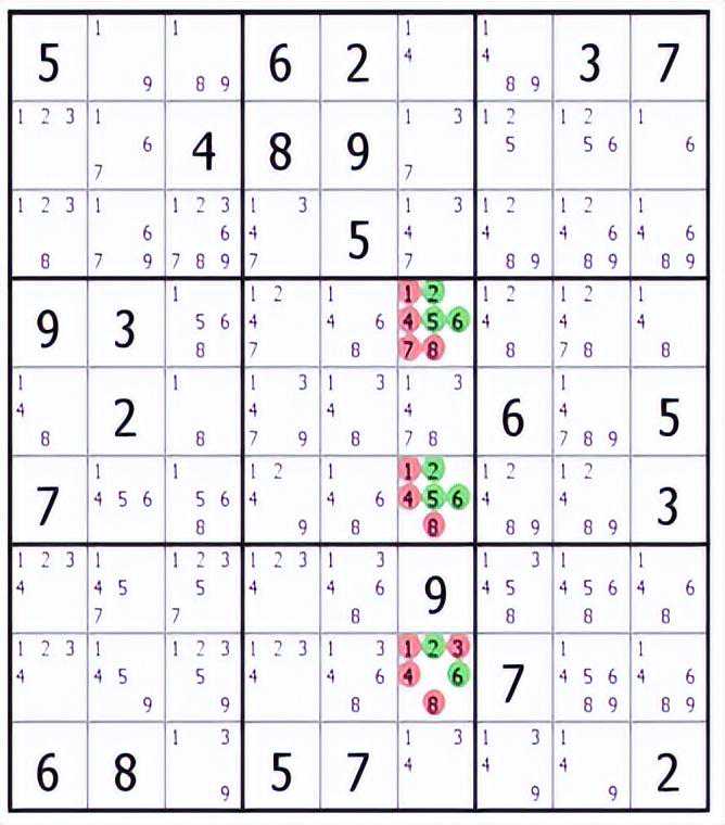 上边的例子,七宫中的三数组摒除:候选数2,4和5仅出现在该单元的格r8c2,r9c2和r9c3中。可以从格r9c2中排除候选数1,从r9c3中排除6。