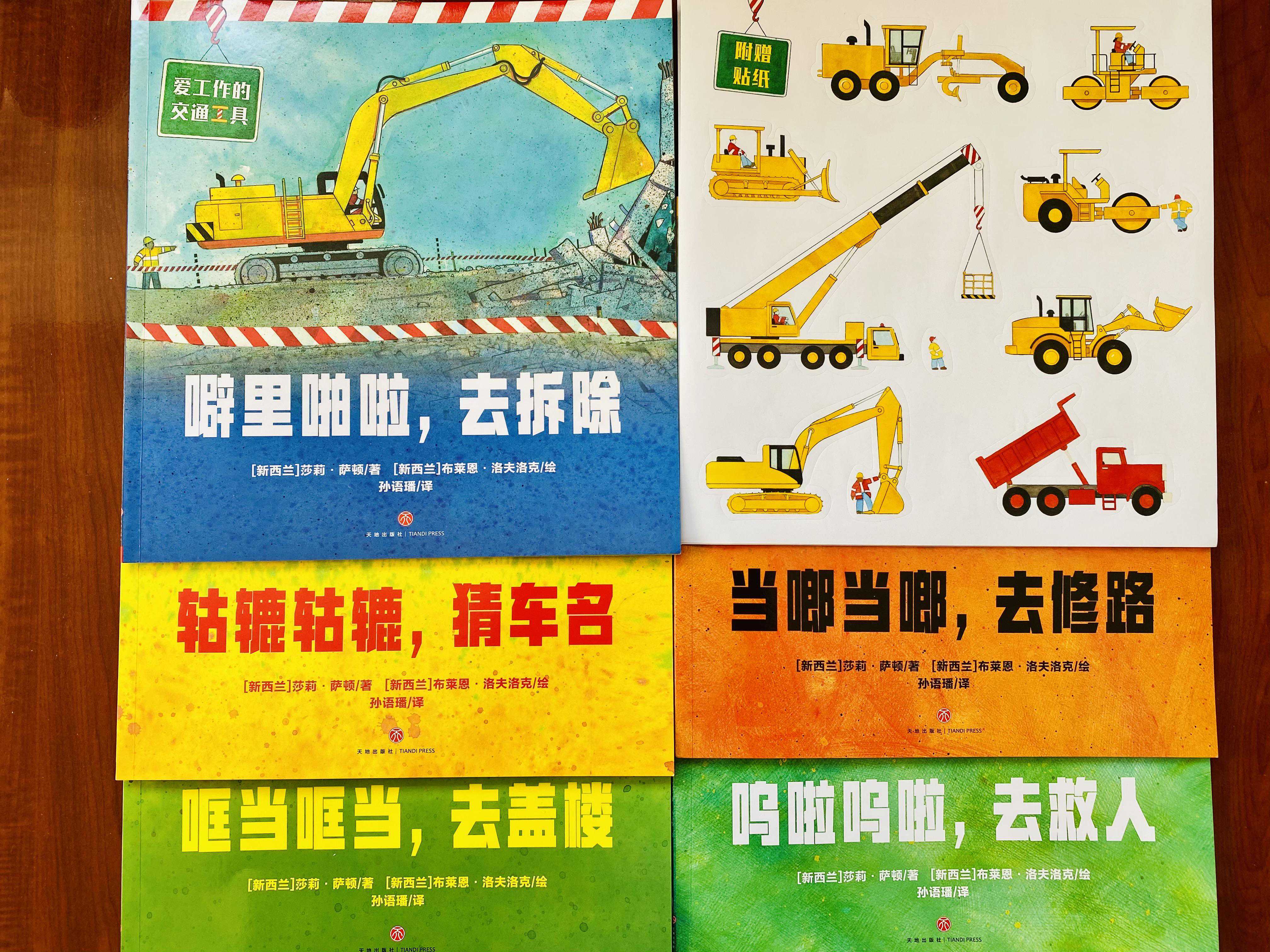 《当啷当啷,去修路》,介绍了修路的整个流程,以及推土机、自卸卡车、装载机等工程车发挥的不同作用。