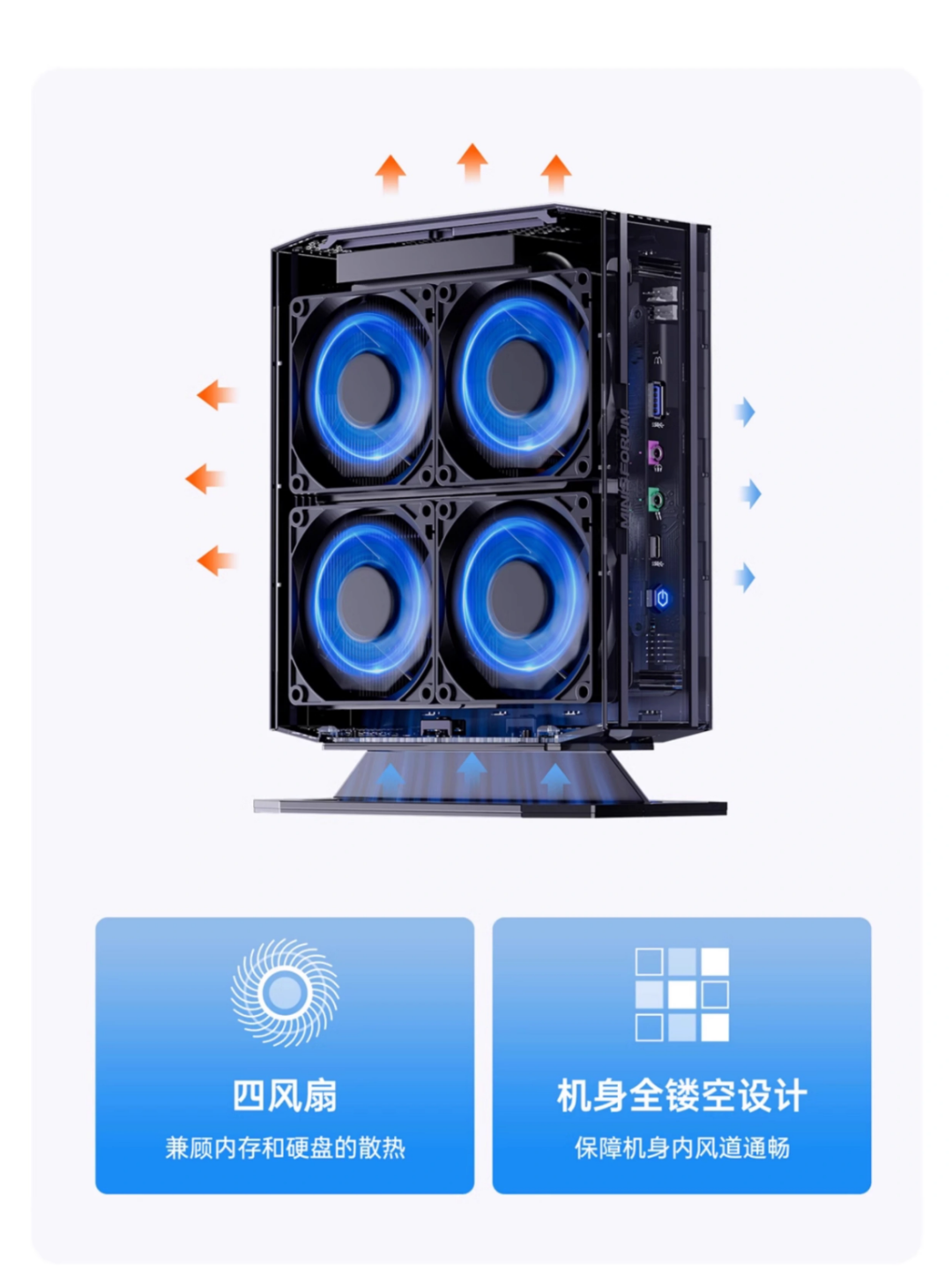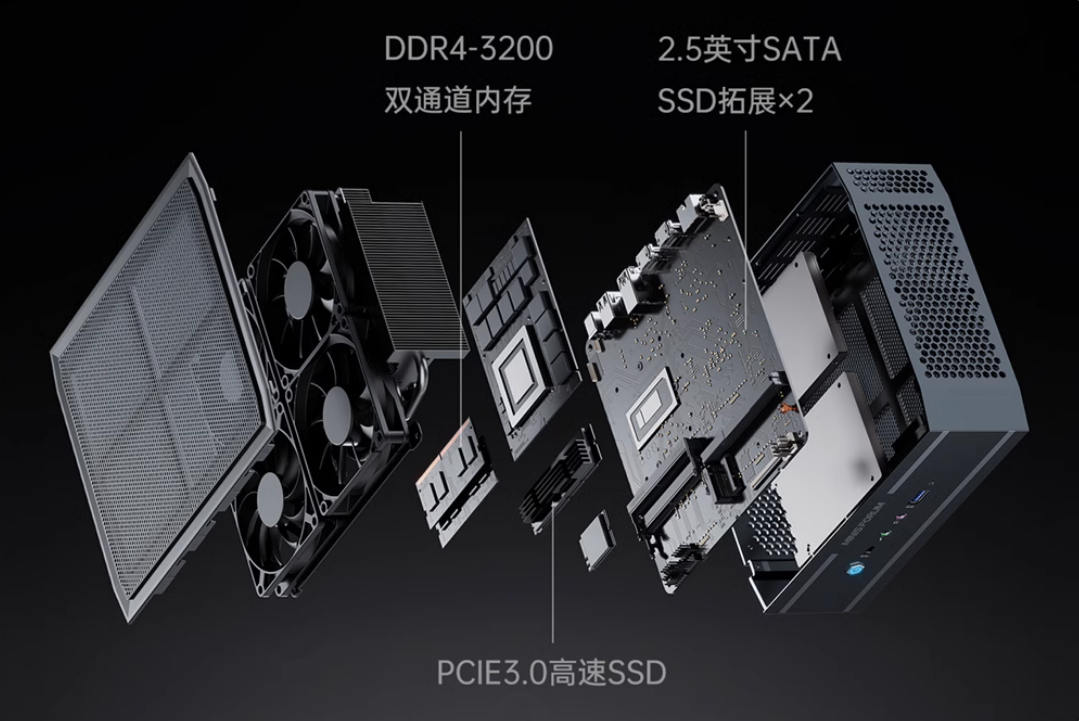 铭凡NAG6内置1个硬盘位,2个2.5英寸硬盘位,最多可以同时安装3块硬盘。内置四风扇散热系统,还能兼顾内存和硬盘的散热。