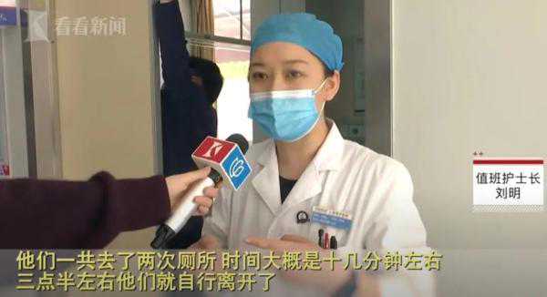 据护士回忆,这对夫妻当时挂了急诊外科,医生给她做了一些简单的检查。这时她称自己便秘、腰痛、肚子胀,然后由老公扶着,去了两次厕所,间隔时间大概在十分钟。大概三点半左右他们就自行离开了,也没有再就诊。