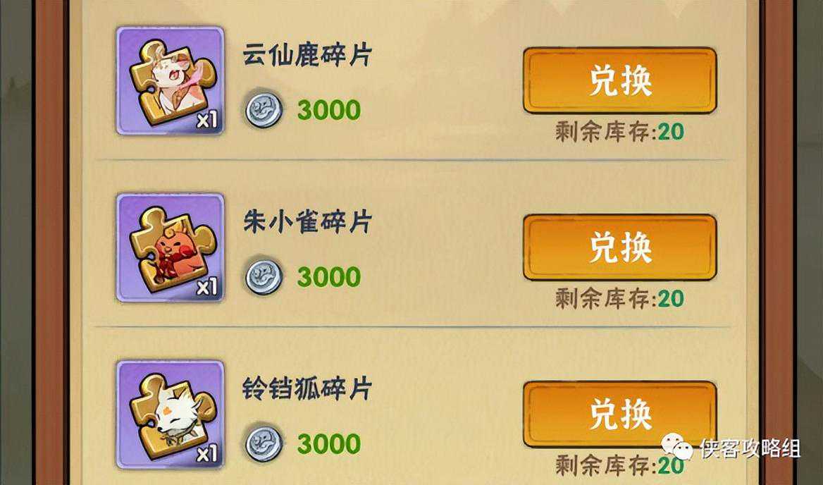 ①3积分可兑换:1捕兽笼(上限999个);1云仙鹿碎片(上限300块);1朱小雀碎片(上限300块);1铃铛狐碎片(上限300块);