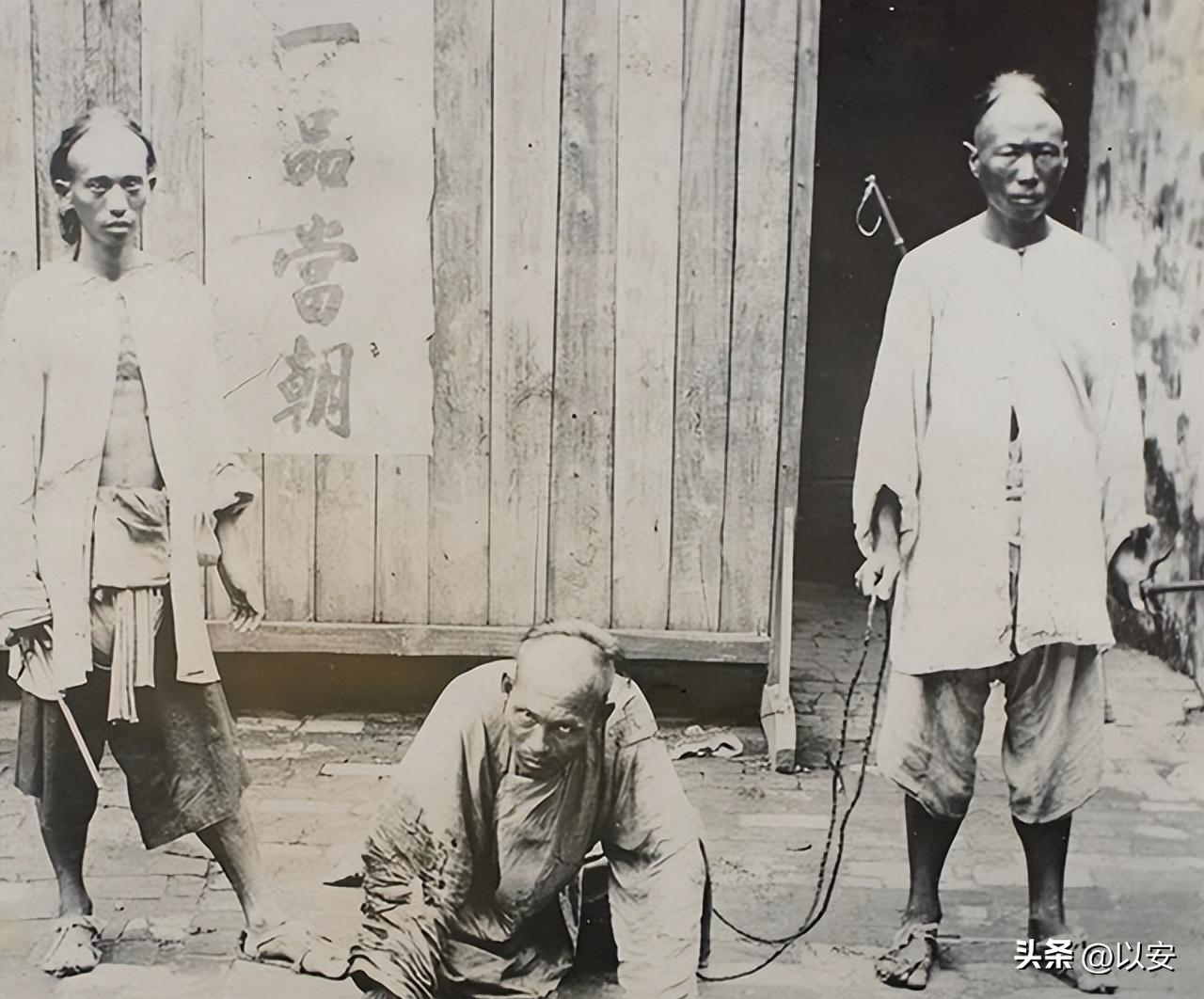 11跪地求饶的囚犯与官府衙役们的留影旧照,老照片中的囚犯眼神满是愤怒与绝望。