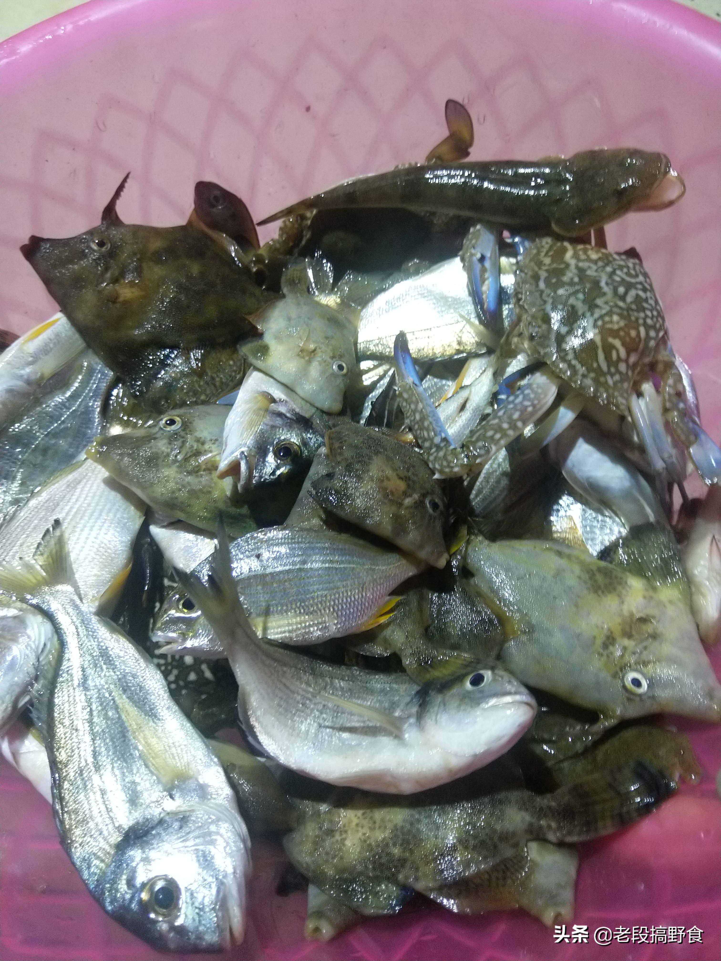 这张头上有刺的是剥皮鱼,鱼鳞多的是腊鱼,这些新鲜捕获的鱼随便下锅一煎就是一道美味,比海鲜市场上买那些打过氧的鲜活鱼类好吃太多。