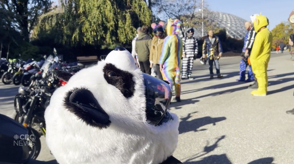 在街上,机车发烧友戴着各式各样的可爱头套,占据马路的C位。