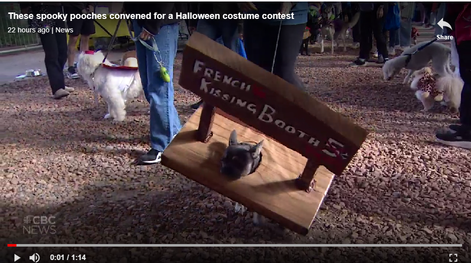 在主人的精心打扮下,狗子们也换上了五颜六色的“服装”。有狗子穿上闪亮的芭蕾舞裙、戴上眼镜和假发,也有狗子被主人“做成热狗”,被cos成厨师的主人抱在胸前。