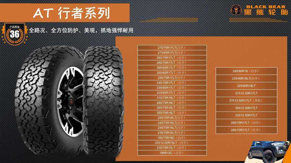 黑熊AT2行者属性更加均衡,所以它的轮胎尺寸规格非常丰富,从小尺寸的195R15C到265/65R17越野车常规尺寸,再到315/75R16、295/40R22这些大尺寸都有,甚至还有37寸、35寸这些大脚尺寸。基本上能够满足吉姆尼到城市型SUV,再到普拉多、兰德酷路泽、途乐,乃至F-150Raptor等车型的轮胎需求。