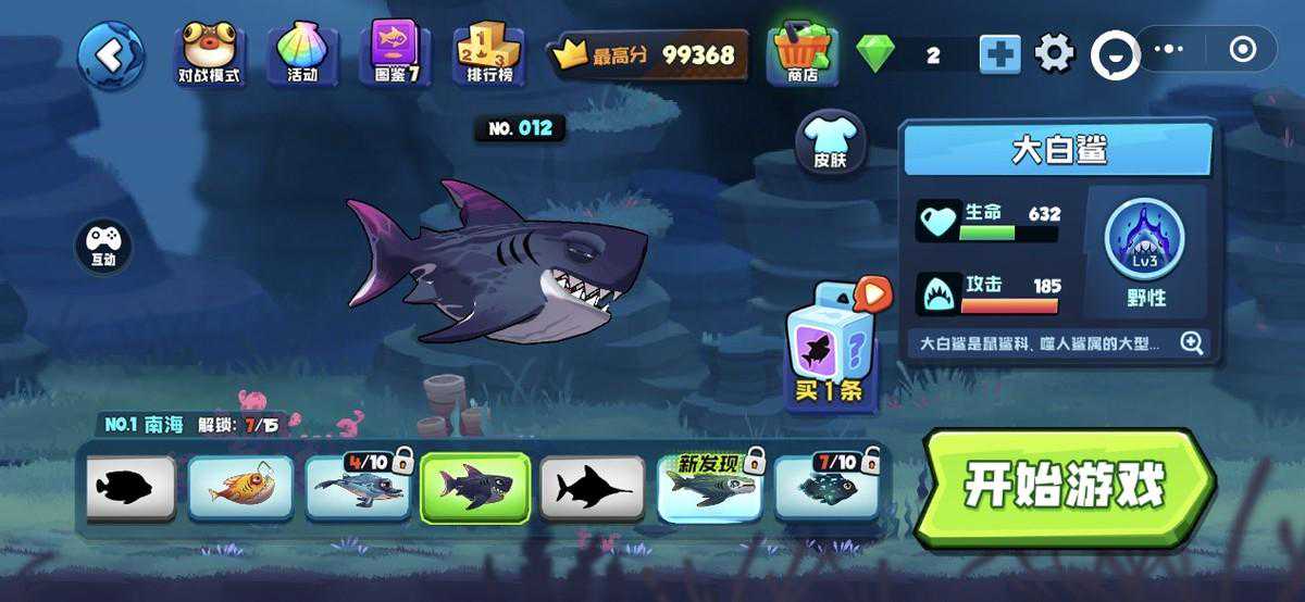 每种鱼类解锁需要靠吞噬这一品类的鱼的数量来决定,达到个数才能解锁。这一游戏的趣味性在于成长和称霸的快乐。对于刚开始玩的玩家,总想着快速成长,成为海域霸主,然后霸榜。理想很丰满,现实很骨感。
