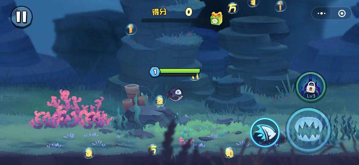 小程序游戏,想着无非跟那些猪砍树、小人分裂这种一样,挂着羊头卖狗肉。点开一看,画质和界面相对友好。主界面直入主题,有许多种鱼类等待解锁。小鱼1级等级开局,靠着吞噬气泡字母长经验升等级。或者靠杀掉其他种类的鱼吃鱼肉升级。