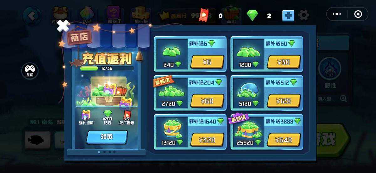 每次复活需要20绿钻,小编算了下,按照6元240钻石,每次复活需要0.5元。因为怀揣着称霸海洋的梦想,小编怒冲6块钱,一次次失败爬起,失败再爬起,竟然玩的有些心酸,像极了生活中拼命向前的自己,虽然很累,也在拼命的在夹缝中寻找一线升级。但是死亡的代价换来的就是6块钱秒没。最起码小编也是个部门负责人,咬咬牙又冲了6块钱,过程是疯狂的,结果是痛苦的。