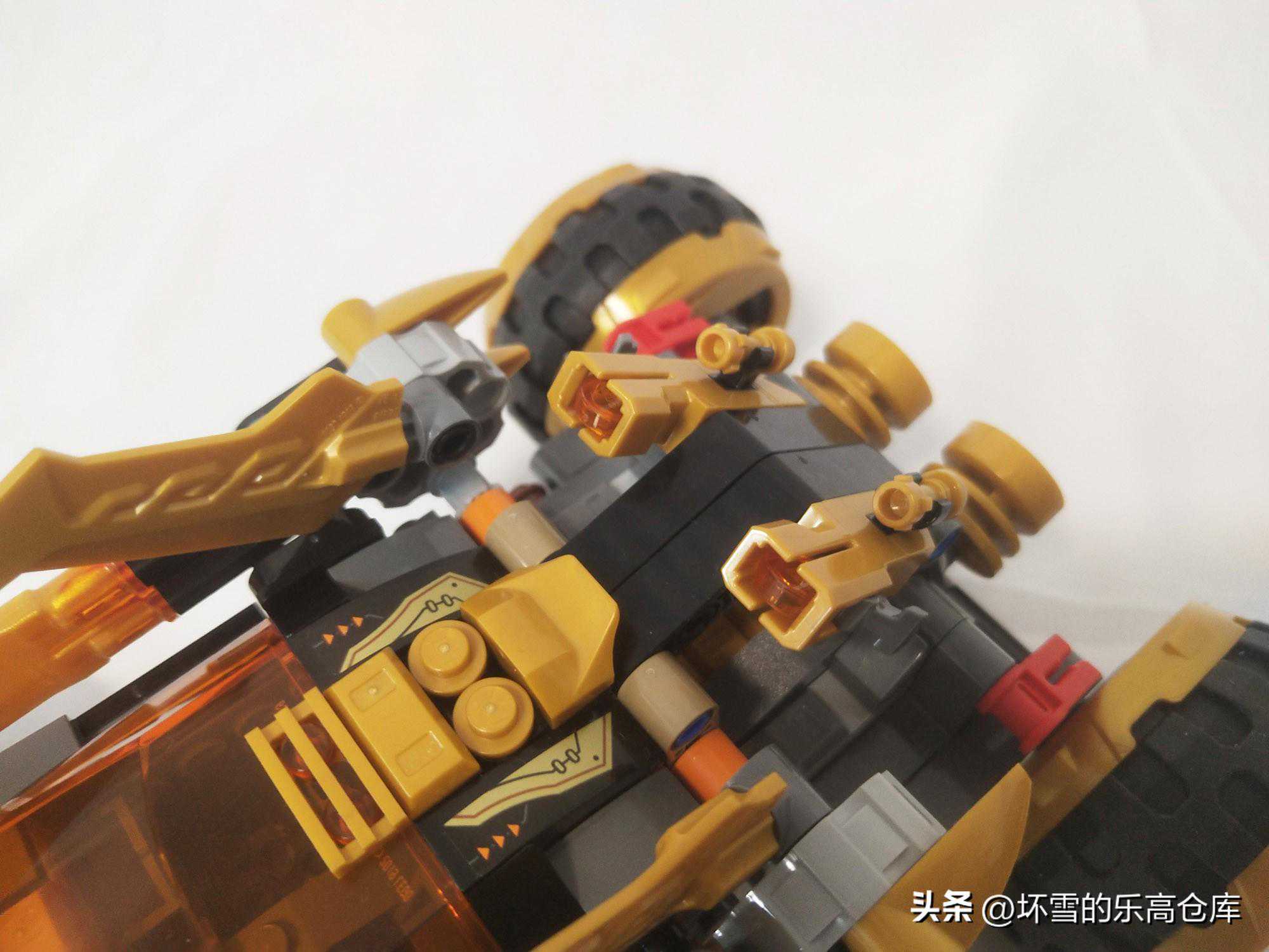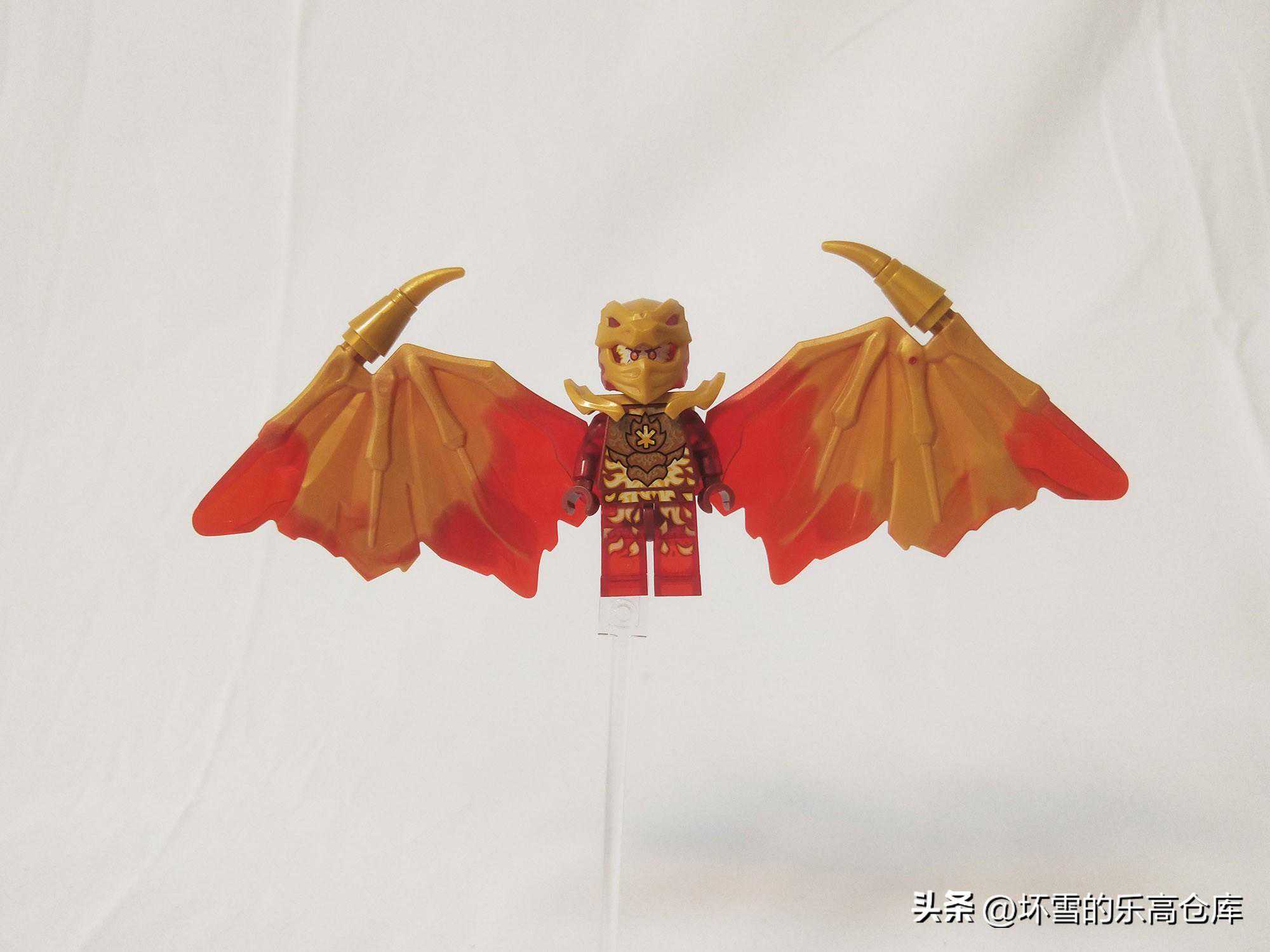 这款金龙凯的人仔非常华丽,整体以金红两色为主。他的躯干有火焰的造型和他名字的忍者语代号,也是让我确定这个长着翅膀的家伙是凯的原因。对忍者语不熟悉的朋友,请搜索我们之前测评71767忍者道场神殿的文章。