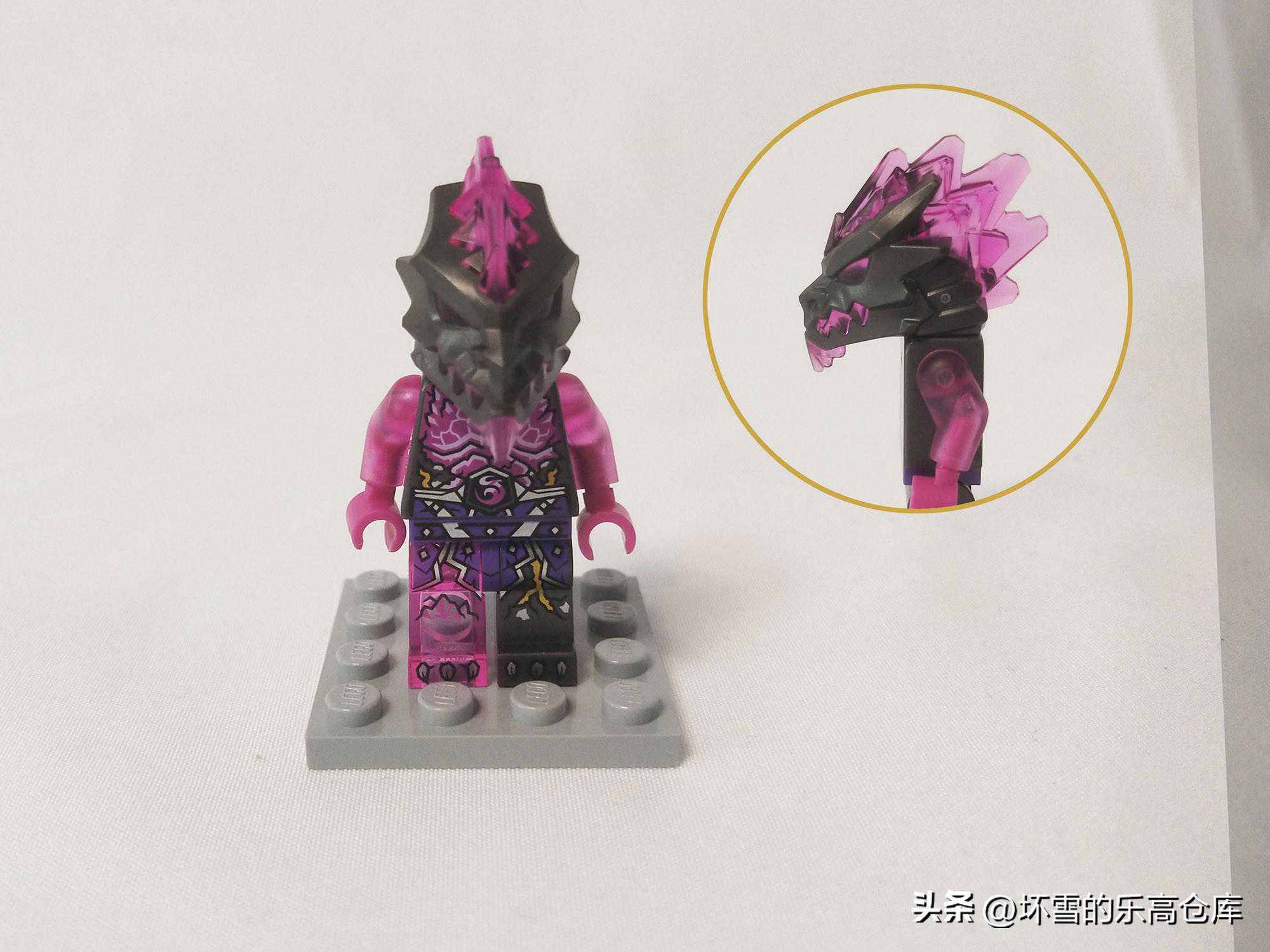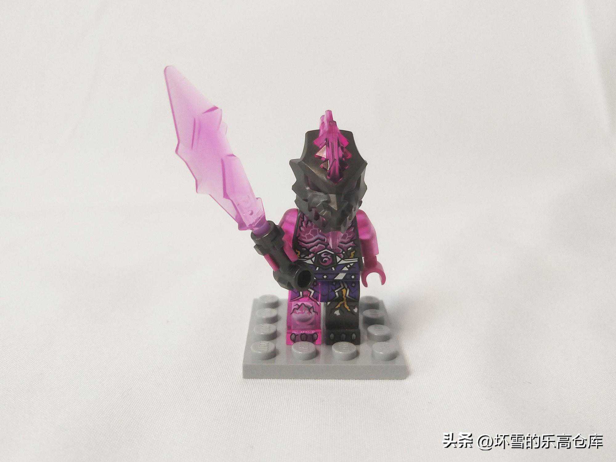 下一个人仔是反派杂兵复仇石士兵,属于该系列的量产士兵,出现在多个该季套装里。它的成分应该是黑色的复仇石和粉紫色的水晶结合的产物。它的躯干可以看到复仇石上特有的黄色花纹和粉紫色的甲片。双臂为透明的紫水晶,腿部为不对称质感,左腿为黑色复仇石材质,右腿为透明紫水晶效果。它的头部为怪兽造型,黑色为主,嘴角的须牙、眼睛和头顶的棘刺均为紫水晶效果。