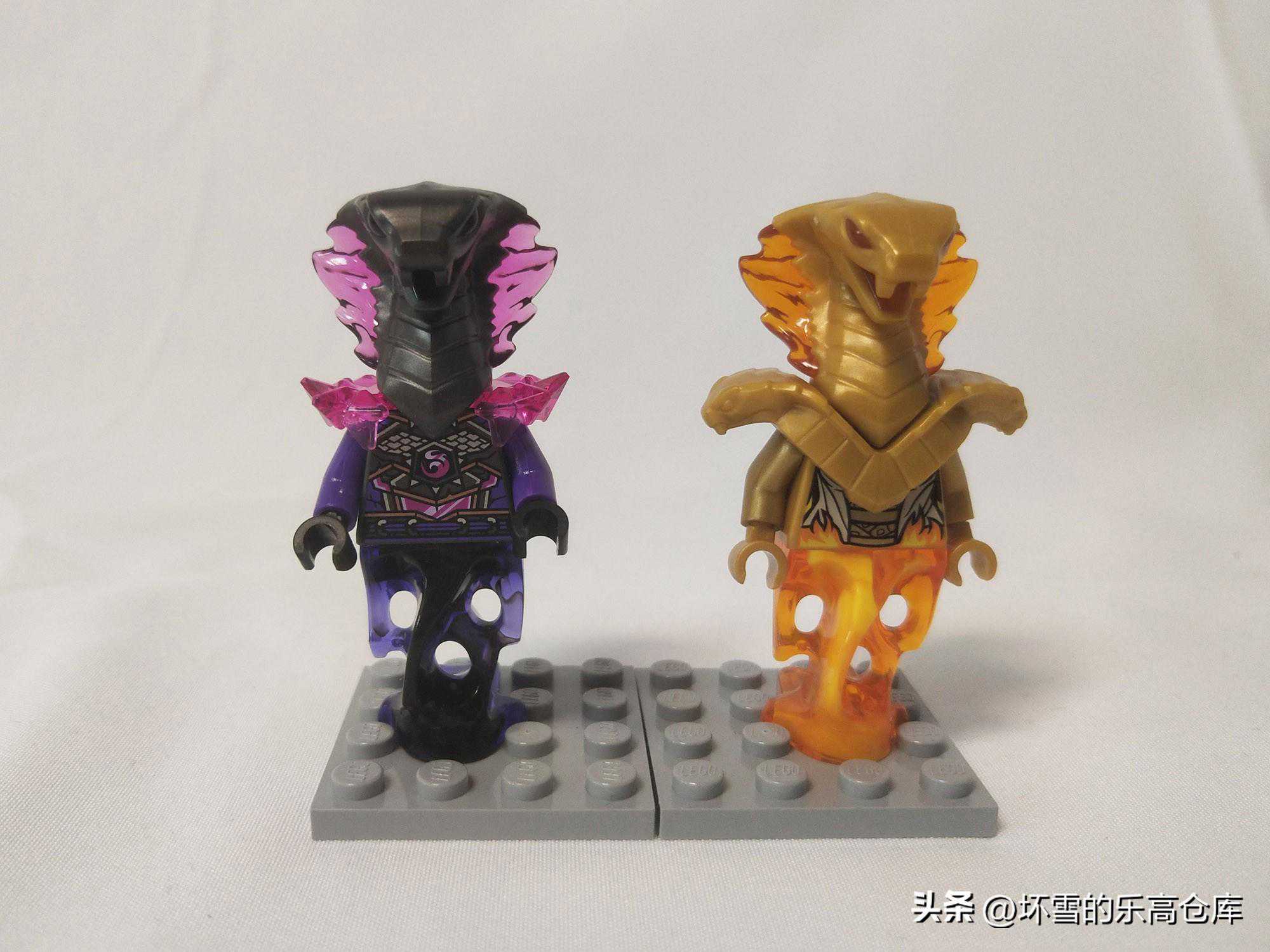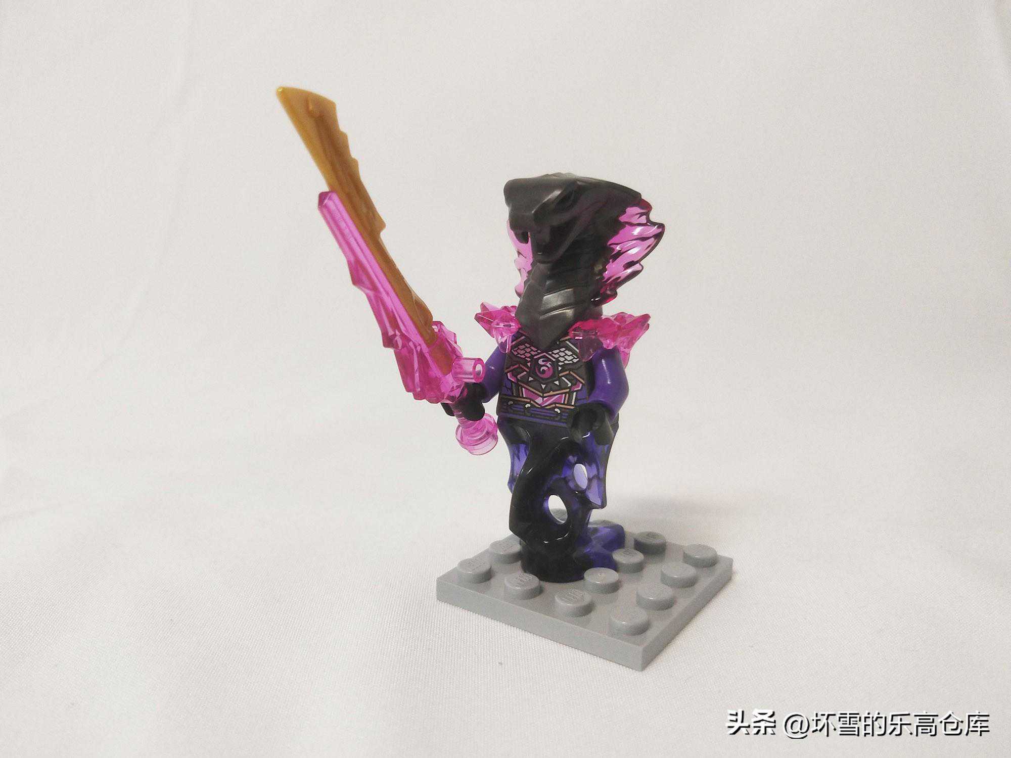 最后一个人仔是阿斯皮尔,曾经的第十一季大反派,如今也成了水晶之王的手下将军。阿斯皮尔是一个蛇形女巫,身上布满了青绿色的鳞片,不过该造型从未在乐高套装中出现过。之前的第十一季套装里,阿斯皮尔由于吸收了凯的火焰力量从而变成了火系蛇女巫的米黄色造型,而在本季上半部分剧集结束时还保持其本来的模样,我们根据套装和各种信息推断,应该是阿斯皮尔在本季后半部分的动画里获得了水晶化的能力,从而变成了套装里的模样。和第十一季的火系造型相比,可以看到两个人仔是几乎一样的设计。阿斯皮尔的头依然是一个邪恶的蛇脸造型,黑色的脖颈外面布满了透明紫水晶。它的双臂是紫色的,肩甲同样是透明的紫水晶质感。