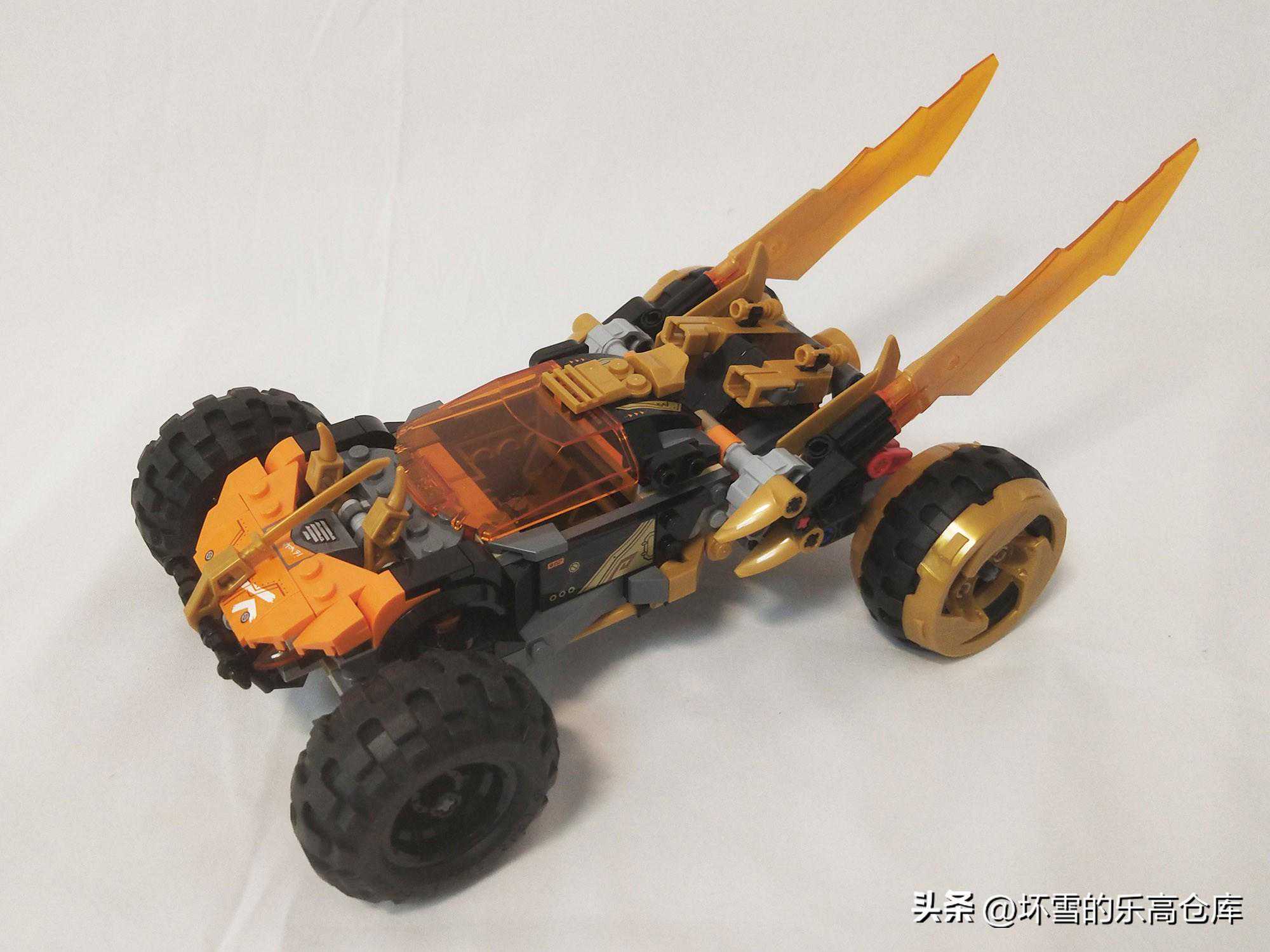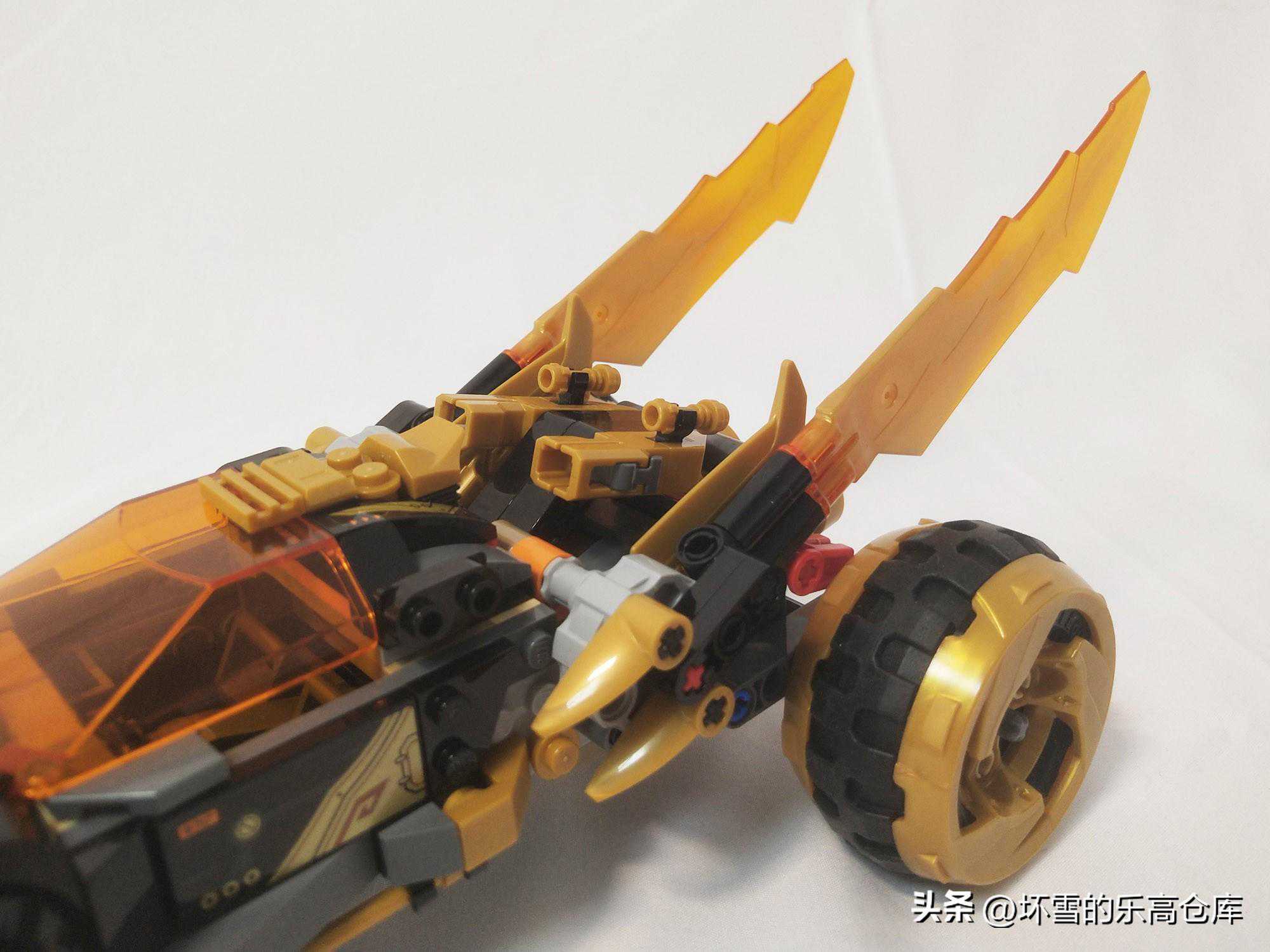 车尾有两片大的刀片,透明金色,非常华丽,单片刀刃达到了十厘米长,带有闪电状的锯齿边缘和纹理。