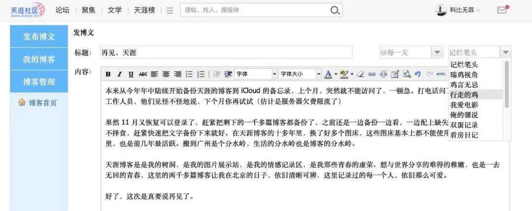 2022年,科比发现,天涯博客隐藏了对外的功能,用户发布的内容只有自己能看,别人不再能够访问。那时候他就隐约意识到,天涯“已经要完蛋了”。