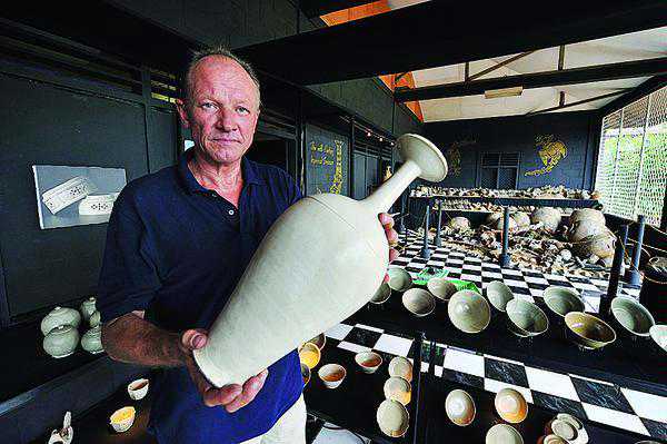 海曼斯手持辽代花瓶,背后是中国秘色瓷