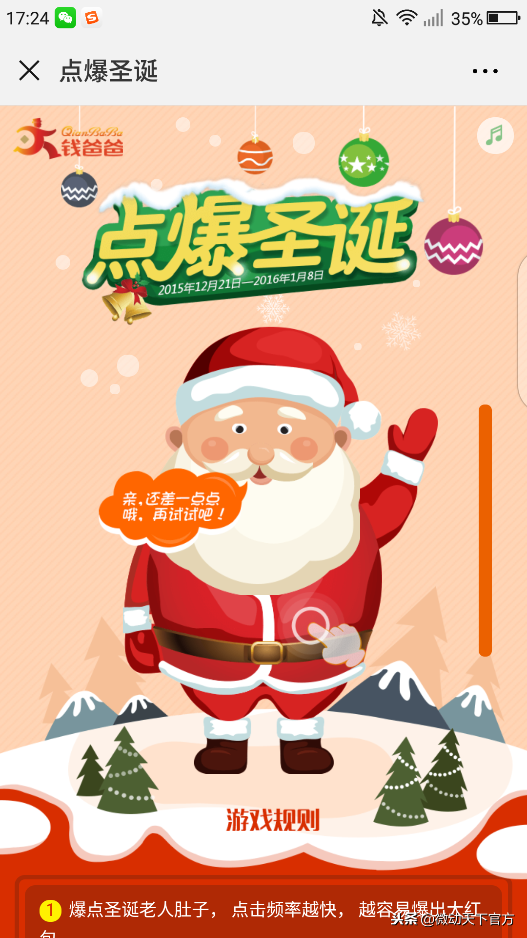 拥有微尘极速版权限的商户可以在后台开通点爆圣诞的小游戏插件。游戏玩法虽简单但十分有趣,引人入胜。可以用于品牌推广、微信公众号引流、公众号粉丝转化、线上微信活动、微信推广活动等,利用这款游戏进行线上涨粉互动、朋友圈传播、以及促成线上引流以及消费转化等营销目的。