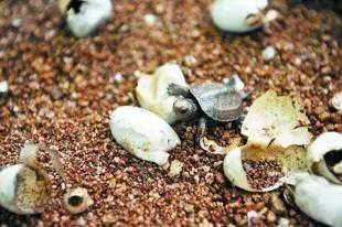 于是这一只刚出生的小乌龟从水里捞去来后,又被丢到营养土的盒子里了,成了万众瞩目的观赏对象了,但是小乌龟并不给面子,几乎一整天都沉睡在泥土下面。好奇的人儿总是拿着小夹子寻找小乌龟的身躯,忍不住地翻出来戏弄一下,但是小乌龟倔强地往更深处钻去,始终不见其踪影!临近中午时,又有一只蛋壳伸出一只小爪子,一帮人的围观,等不及地为其呐喊,以为它能很快就出来了,午饭都延后去吃了,就怕错过这惊奇的时刻。但是耐心一点点耗尽后,各自散去,即使吃完午饭后,破壳的小爪子都没有更多的动作,一会缩进去、一会伸出来,头部也伸出来过,但是仍旧只有小小的一个裂口。总有同事拿着小夹子来轻轻触碰,嘴里轻轻喊着“加油啊”,甚至是大动作的翻动,还有人责备这只待出的小乌龟太懒了,不努力破壳。