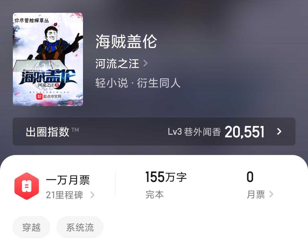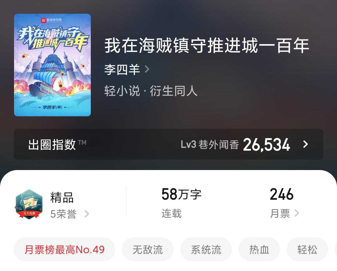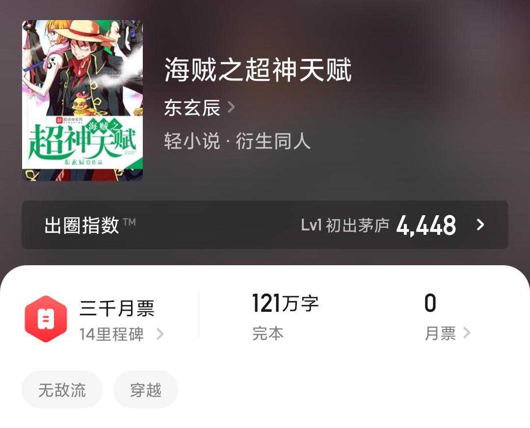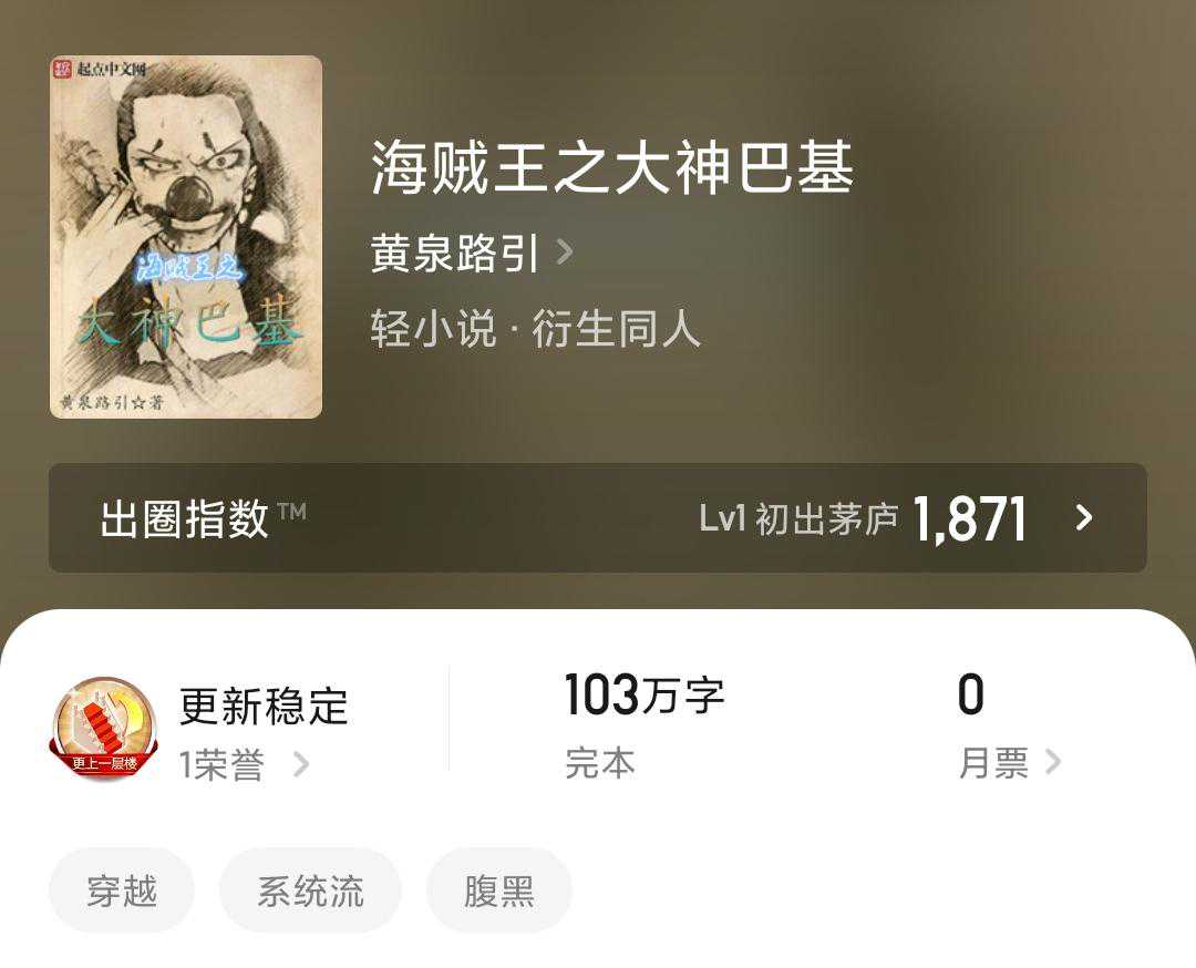 书评:半海贼同人半原创,未看过动漫不影响阅读,没有人没看过海贼吧!无敌流爽文。要一口气看完才能感觉到舒适的放松感。从文笔来说,属于平均水平线上,金手指是逮人就能复制犯人的属性往身上加,后面更发展出猫捉老鼠般的抓了放放了抓的薅羊毛姿势,绿色无污染可持续,在推进城苟上一段时间就无敌了;后面开始星辰大海了是好是坏看人了,前面写得真不错。我们的征途是星辰大海!