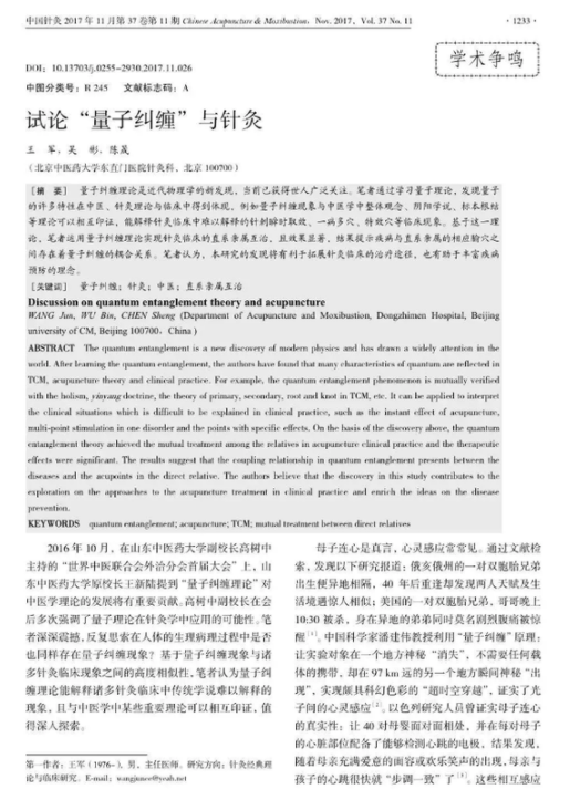 2018年9月14日,一种“给母亲扎针,就能给孩子治病”的治疗手段走红网络。据悉,该治疗手段来自北京中医药大学东直门医院针灸科医生王军等人的一篇论文——《试论“量子纠缠”与针灸》。