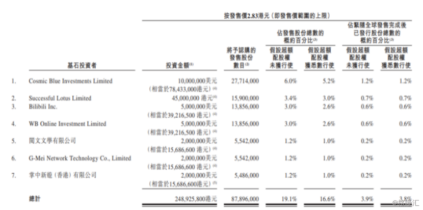值得注意得是,中手游目前获七位基石投资者认购,包括社交娱乐巨头快手、Bilibili、微博、阅文集团、三七互娱、掌趣科技,以及恒地地产主席李家杰共投资约2.5亿港元。