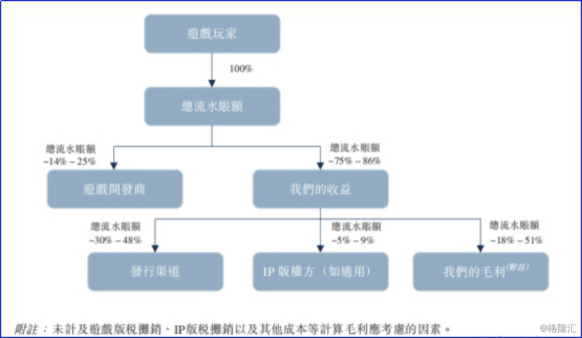 其中,中手游游戏发行业务的模式:中手游的游戏大多数都是免费下载,主要通过提供发行服务,换取游戏玩家在游戏内消费支付的部分总流水额。第三方发行渠道会保留应占部分的分成后会向中手游转会总流水帐额从而形成现金流,具体模式如下图所示。