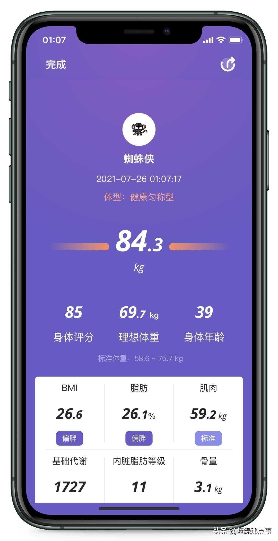 真是不测不知道,一测吓一跳。一直以为自我状态良好,没想到身体年龄显示在39岁,BMI:26.6偏胖。