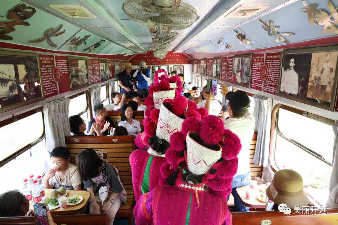 另一边,小火车1号车厢销展台上,“云恢290”、南疆白柠檬、甜藠头等开远特色产品琳琅满目。车厢内,游客们一边欣赏沿线旖旎风光一边品尝着开远本地产的大枣、葡萄、蜜桃等特色水果,彝族大姐唱着歌儿挨个敬酒,歌声、欢笑声陪伴整个旅程。