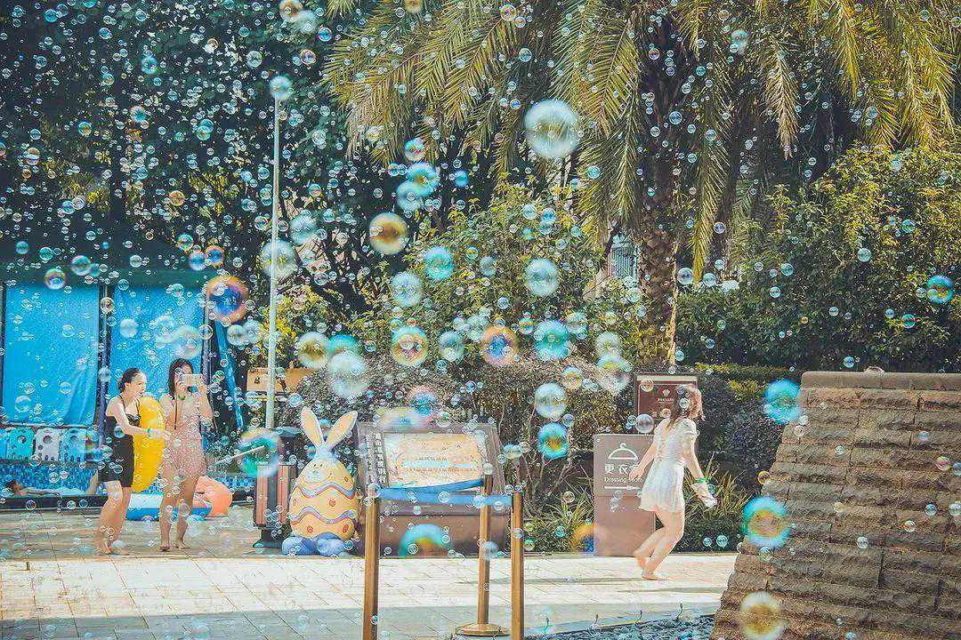 泳道全长1.3公里,顺着泳道游玩还可以穿越到大泳池,玩累了还可以在道具上小憩一下!
