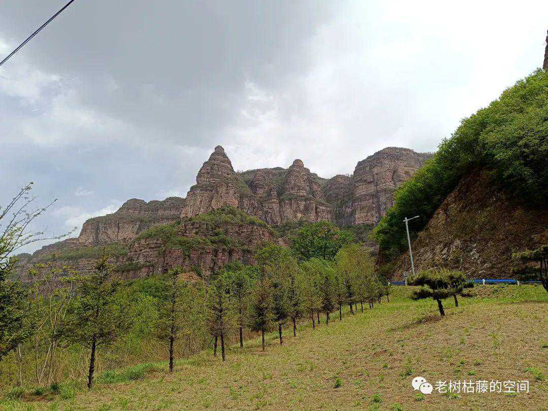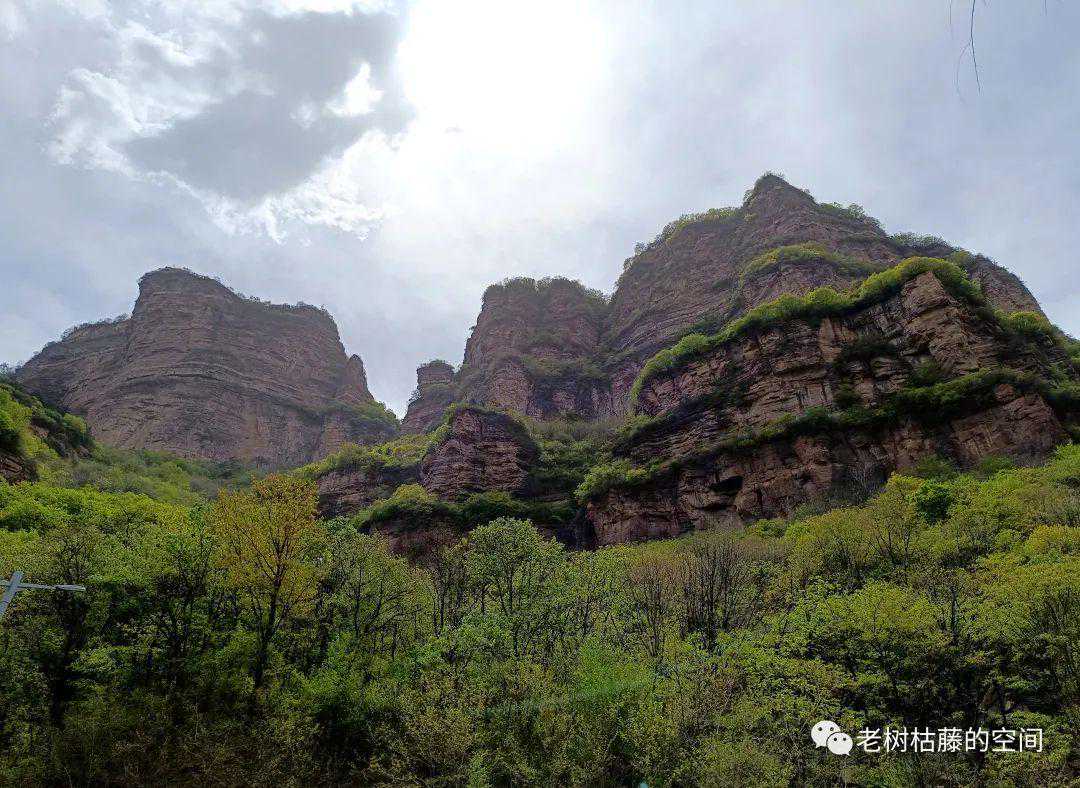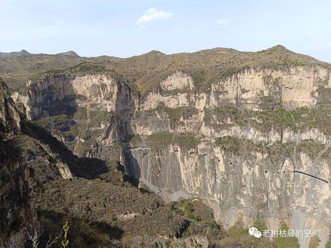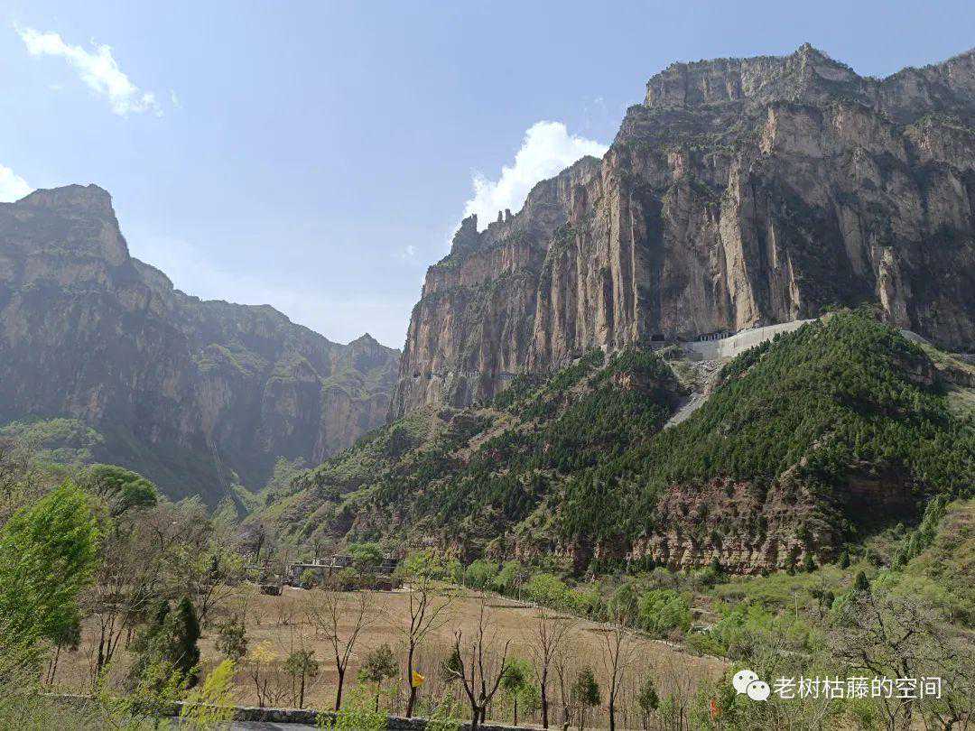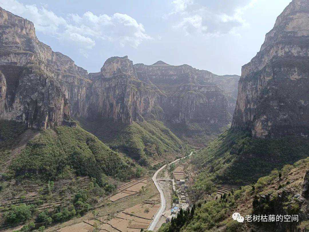 立于路边自下往上看,谷底阡陌纵横,山坡葱笼苍翠,坡顶危峰兀立,直插云霄,太行之雄、之秀、之奇、之险尽收眼底。