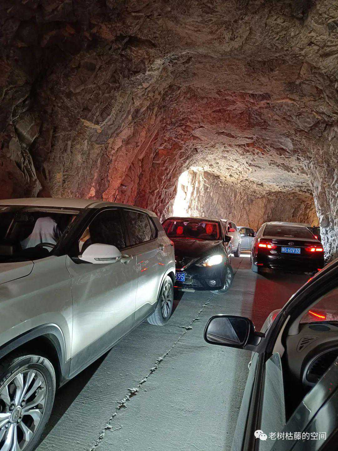 由于一辆中型客车穿越挂壁公路,会车困难,导致挂壁公路内堵车,因道路狭窄,既使徒步也难通过堵点,只好安坐车上打量洞壁,原始的开凿痕迹,有些地方已疏松,成为安全隐患,曾经墙壁上安放炸药的炮眼或撬痕仿佛在讲述着开筑者的艰辛,那是一种精神,一种当代愚公移山的精神。