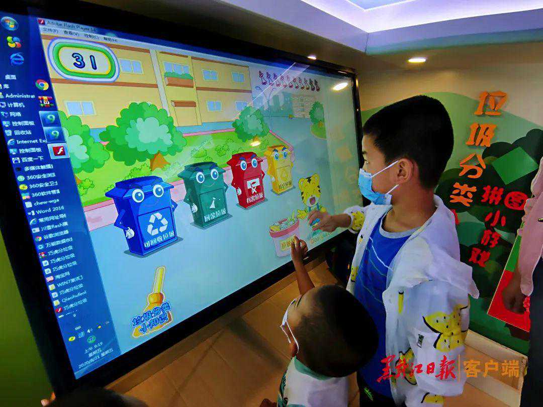 在互动体验区,绿海社区6岁小朋友王梓屹正和伙伴们玩得不亦乐乎。王梓屹说:“比起看宣传册里面的垃圾分类知识,这个垃圾分类闯关游戏有意思多了,里面的巧虎是我们熟悉的卡通人,和它一起互动我对垃圾分类知识记得牢了。”