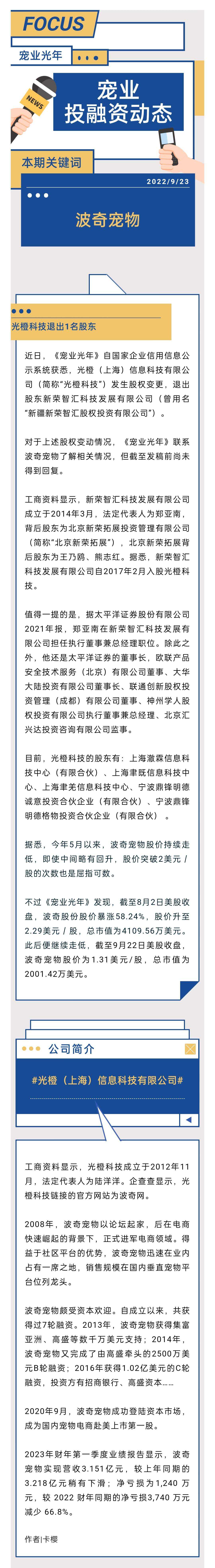 近日,《宠业光年》自国家企业信用信息公示系统获悉,光橙(上海)信息科技有限公司(简称“光橙科技”)发生股权变更,退出股东新荣智汇科技发展有限公司(曾用名“新疆新荣智汇股权投资有限公司”)。