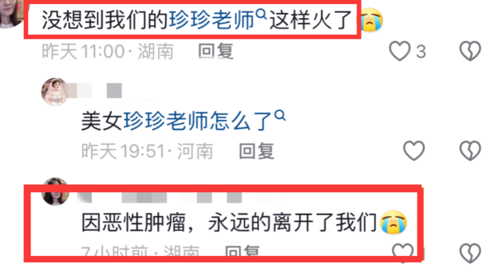 据悉,珍珍老师从发现自己身患恶性肿瘤到离去只有两个月的时间。