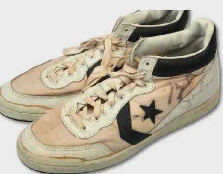 乔丹在1984年奥运会决赛的比赛用鞋,侧面有亲笔签名,以19.3万美金价格售出,那场洛杉矶奥运金牌争夺战里,他得到29分。