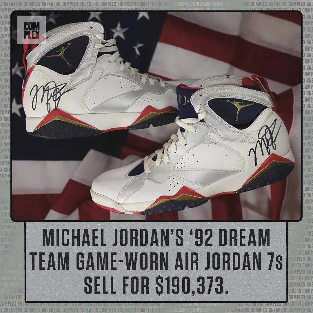 乔丹在参加1992年巴塞罗那奥运会时,穿着的AirJordan7以19万美元(约人民币135万元)的价格售出。