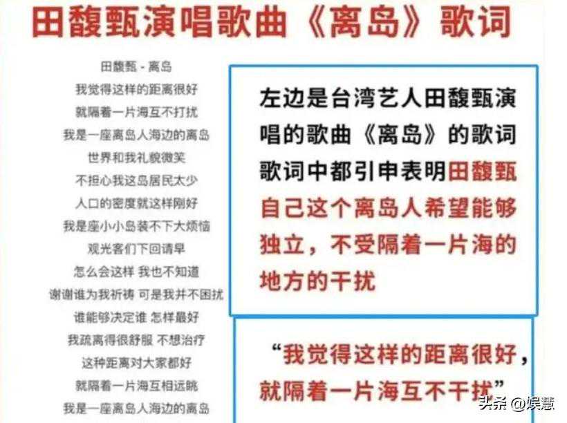 引发公众质疑后,田馥甄昔日在综艺节目当中的言论,以及早期歌曲《离岛》的歌词争议等悉数被扒出。