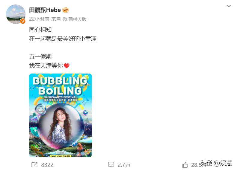 4月24日晚,田馥甄通过微博账号公开5月2日的演出海报,确定将在五一期间前往天津参加泡泡岛音乐与艺术节的演出。