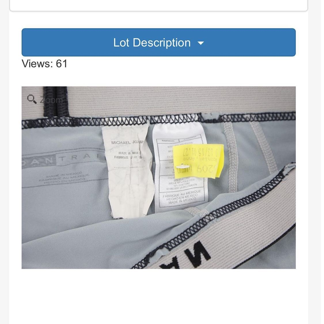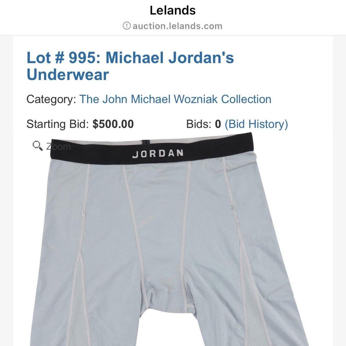 是的,你没有看错,这条内裤据称是乔丹球员时期打比赛时穿过的,暂不清楚到底是贴身内裤,还是保护用的弹力短裤。但上面的飞人商标都清晰可见。这条内裤的起拍价为500美元,网友可以在未来25天内继续竞价。