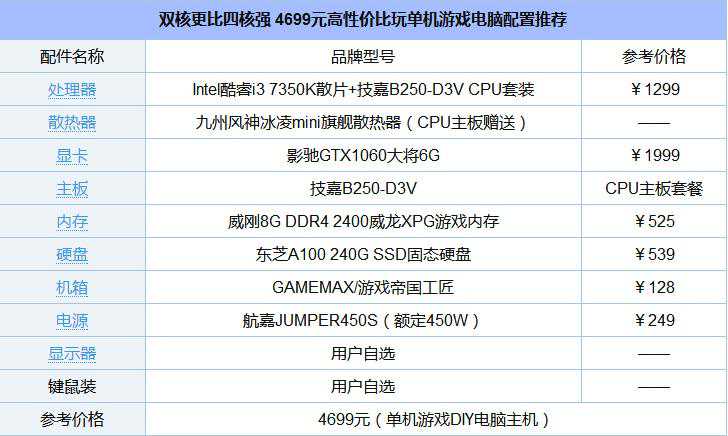 DIY组装电脑如今在热度上已经大不如前,不过鉴于其灵活性、性能好、性价比高、散热好等特性,依然是游戏爱好者热选。对于游戏装机友来说,对显卡的要求往往比CPU高,尤其是单机游戏大作,对核心数要求并不高,反而是一些高主高双核高主频CPU比普通四核更具优势。今天电脑百事针对2017单机游戏装机友,推荐一套4699元i37350K+GTX1060高性价比适合玩单机游戏主机配置推荐。