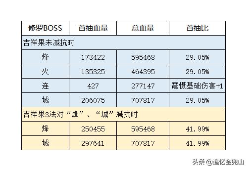 两种情况对比可知,吉祥果未减抗时,二转男魔没有达到满抽状态;吉祥果3法减抗后的首抽比略高于一般修罗主怪的满抽比,是否达到满抽,本人没有验证;两种情况下的BOSS血量和首抽比数据见下图。